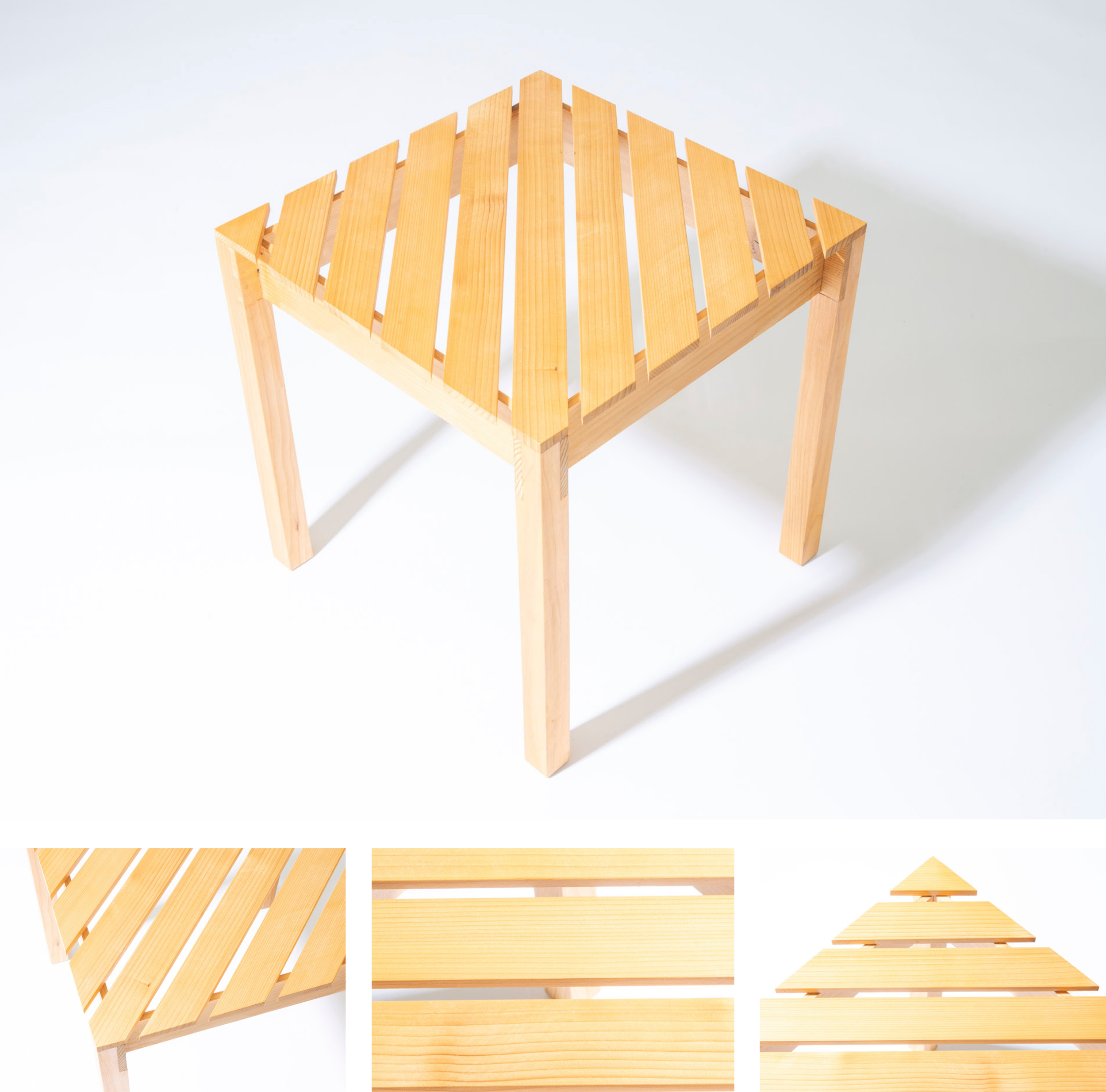 The SLAT Side Table started as a stool and is an experiment in delicacy. It is barely strong enough to sit on, so it is better off being a table. To create an integrated whole the dimensions of each element are multiples of each other.